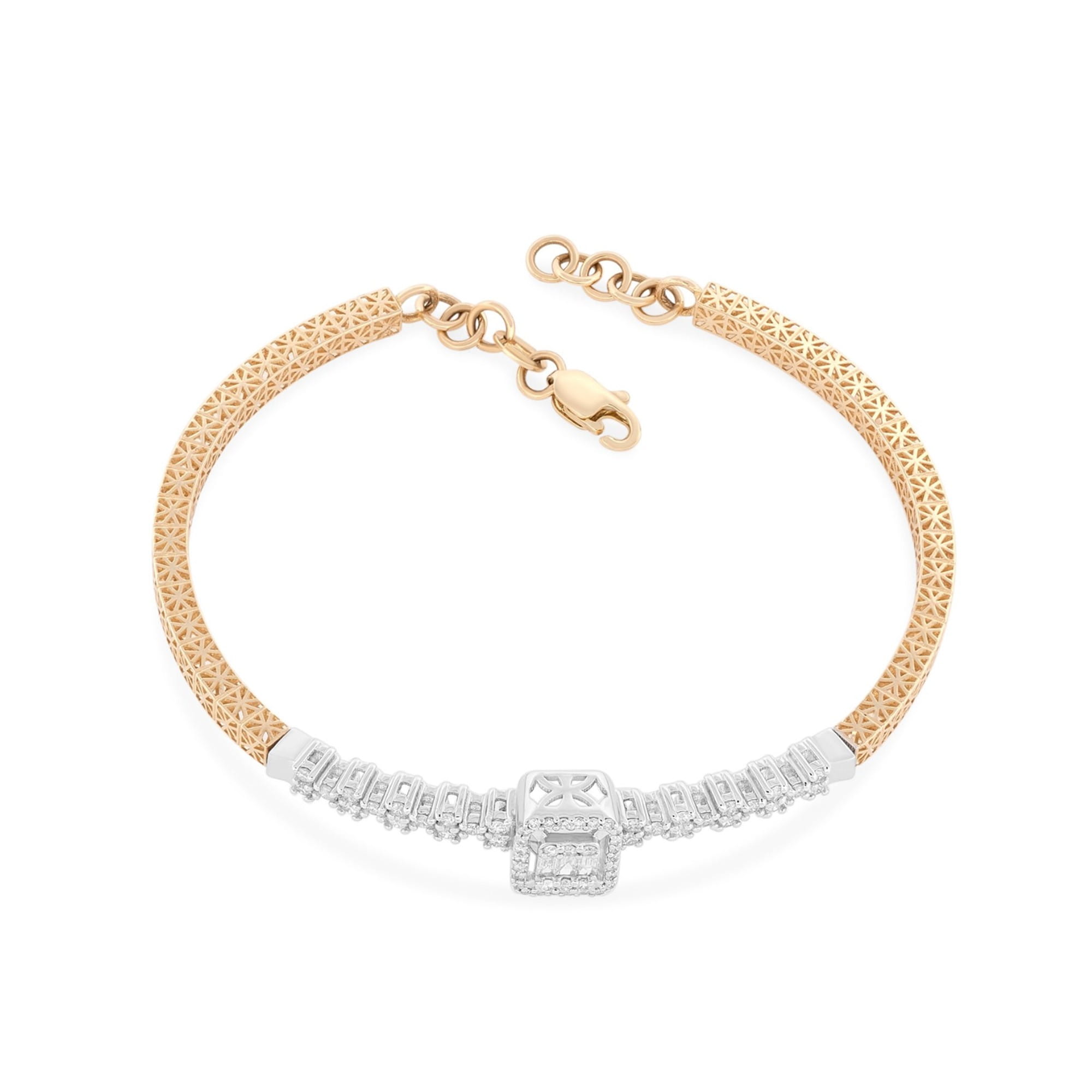 Pozostała część bransoletki została wykonana z żółtego złota o ażurowym wzorze, co nadaje całości niepowtarzalnego uroku i subtelności. To połączenie złotego blasku i diamentów tworzy harmonijną i luksusową całość, która z pewnością przyciągnie uwagę każdego.