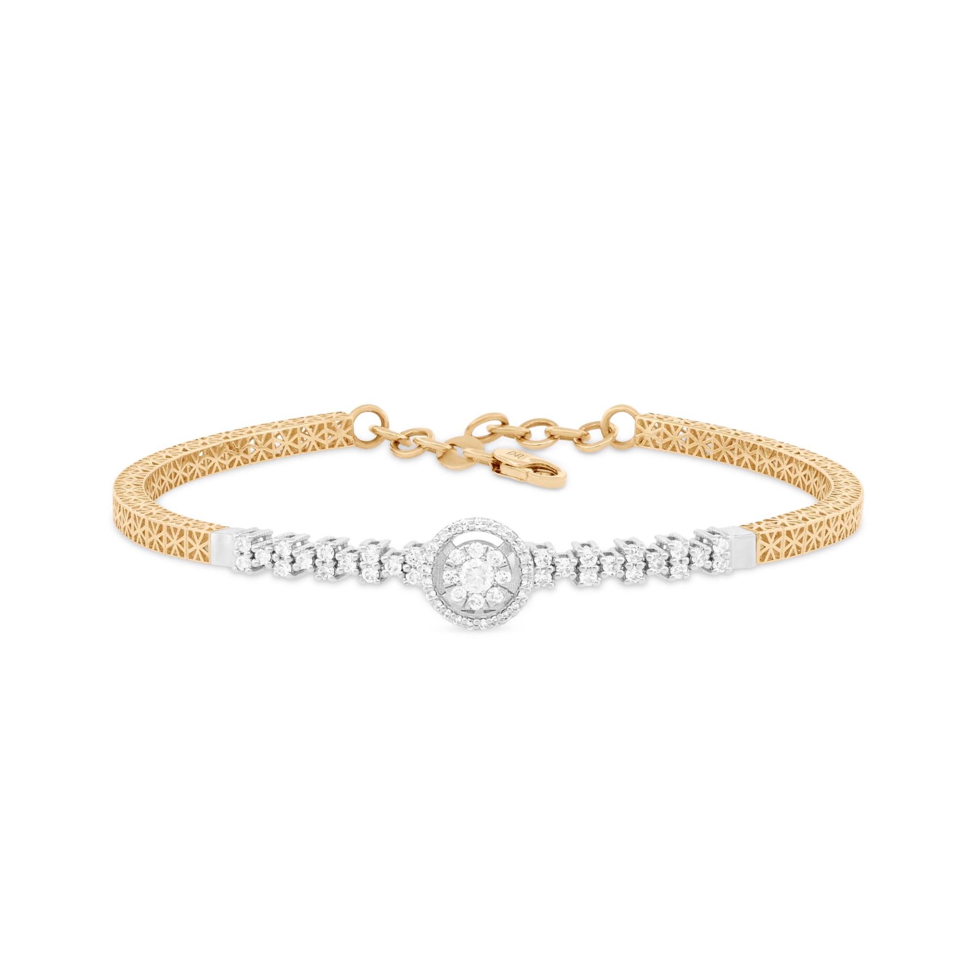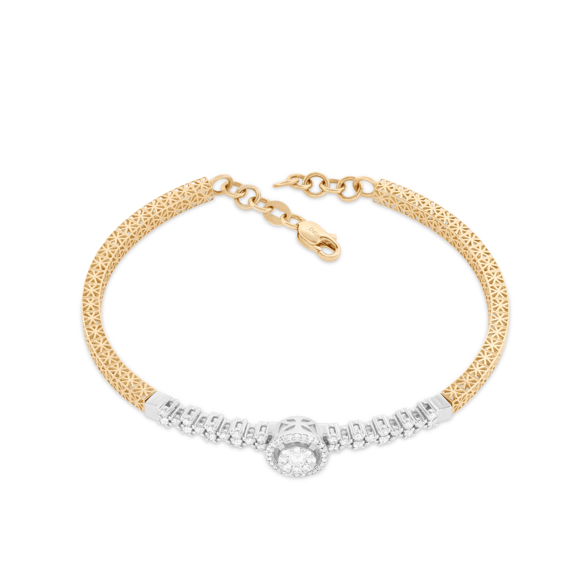 Diamenty w centralnej części białego złota tworzą wyjątkowy blask i są subtelnym dodatkiem do bransolety. Połączenie dwóch rodzajów złota - białego i żółtego, nadaje tej bransoletce niezwykłego uroku. Żółte złoto o ażurowym wzorze nadaje jej charakteru i dodaje nutkę romantyzmu.