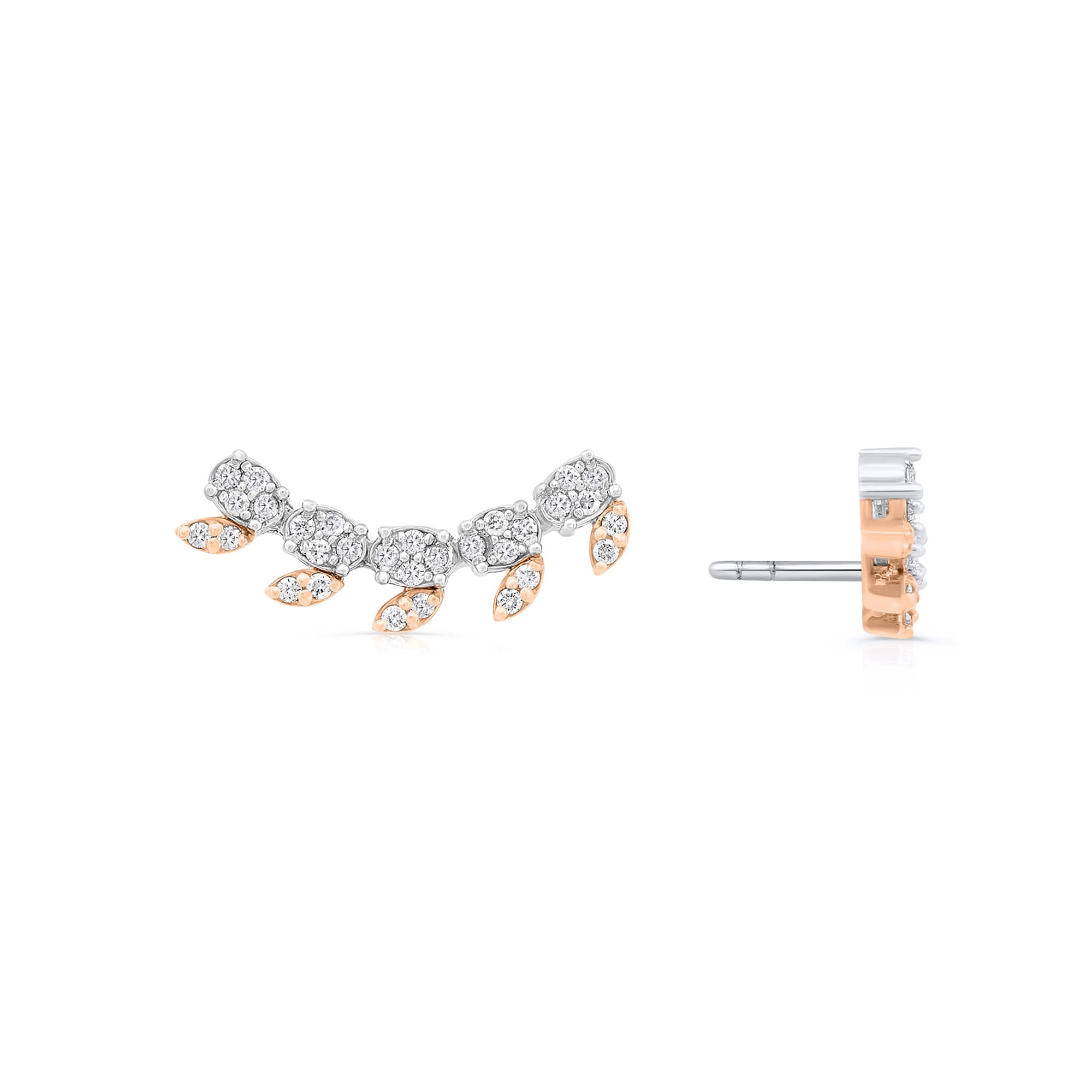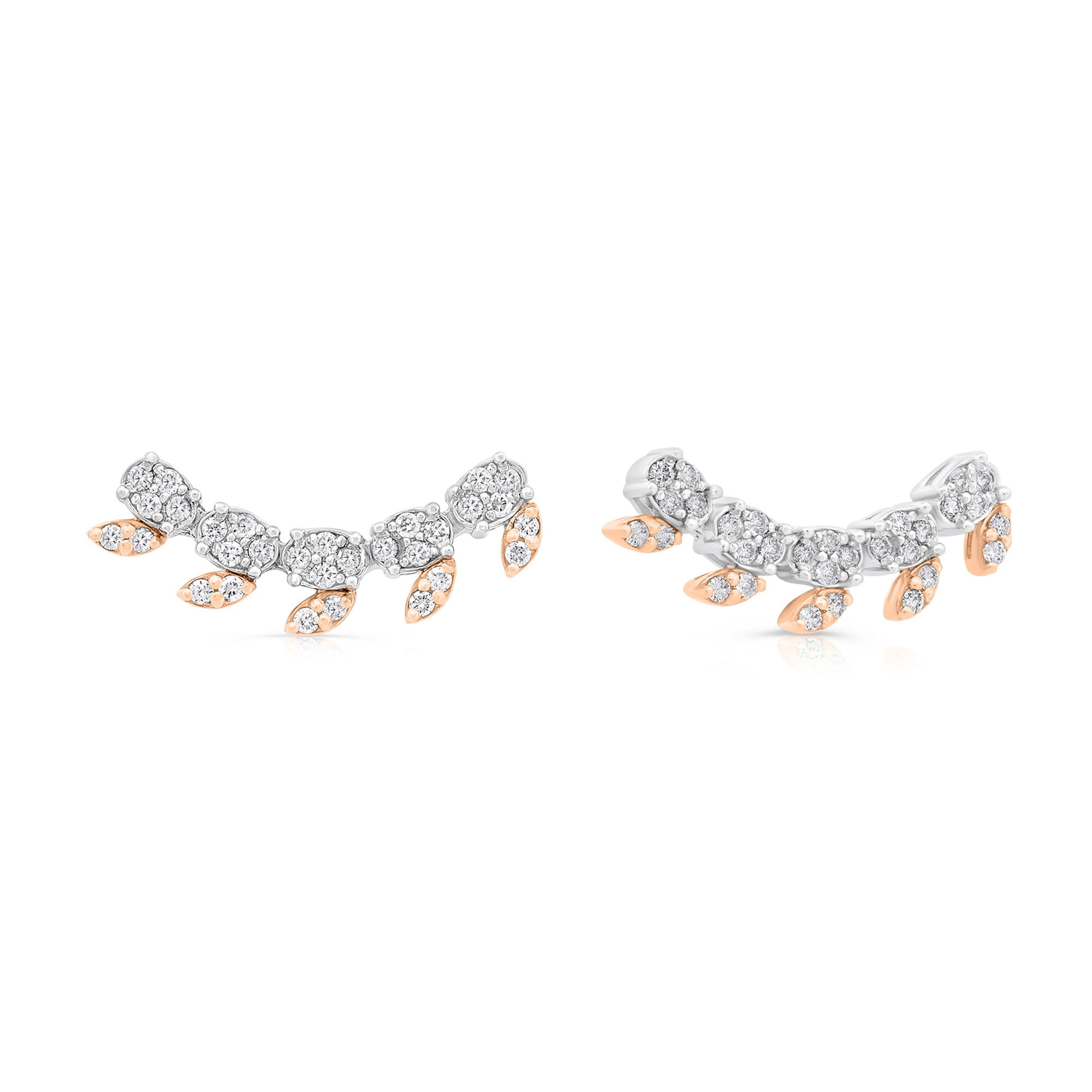 Ten model kolczyków z diamentami są prawdziwym odzwierciedleniem piękna natury w świecie biżuterii. Skomponowane z 60 diamentów, subtelnie ułożonych w białym i różowym złocie, ich kształt przypomina delikatne liście, emanując miłością do otaczającego nas świata.