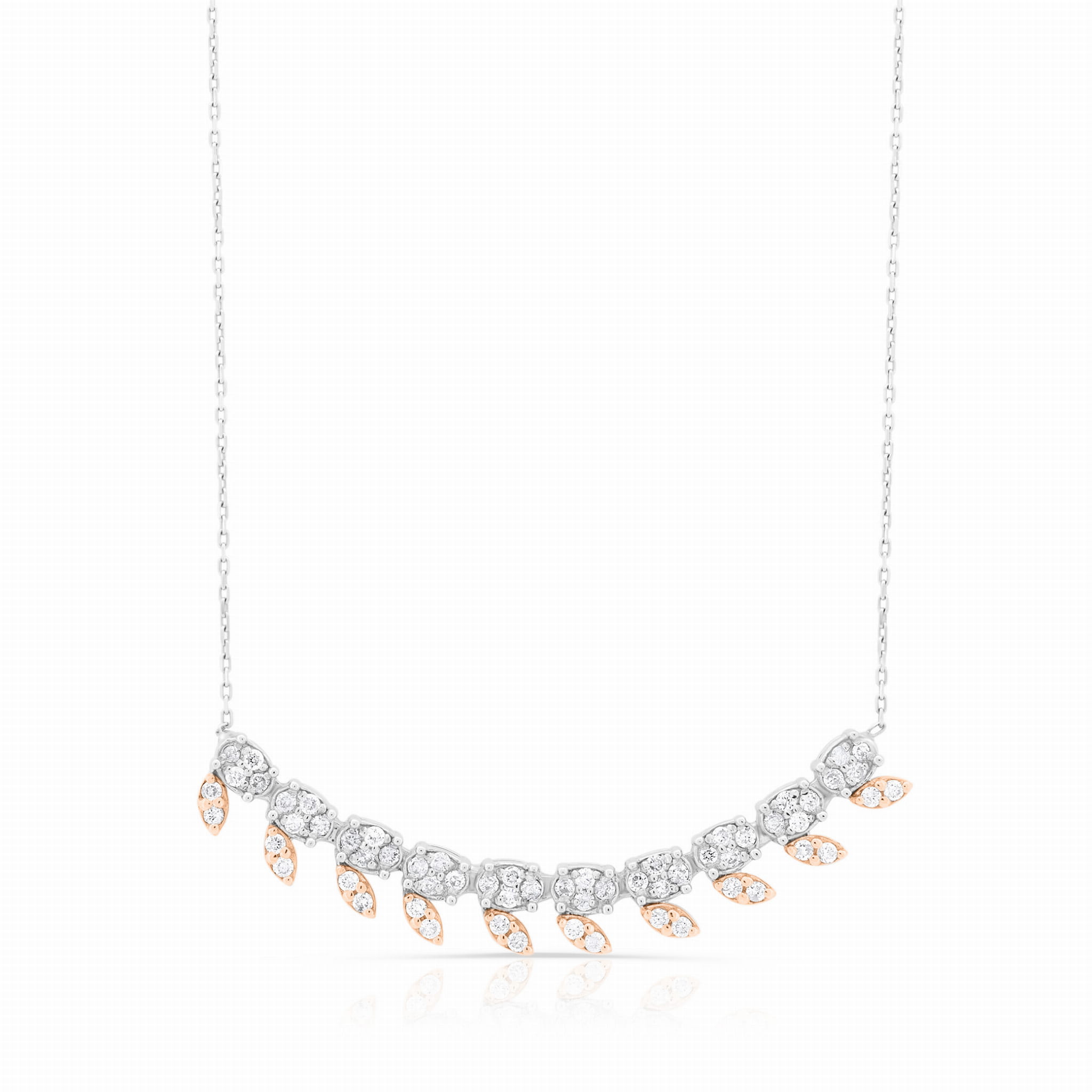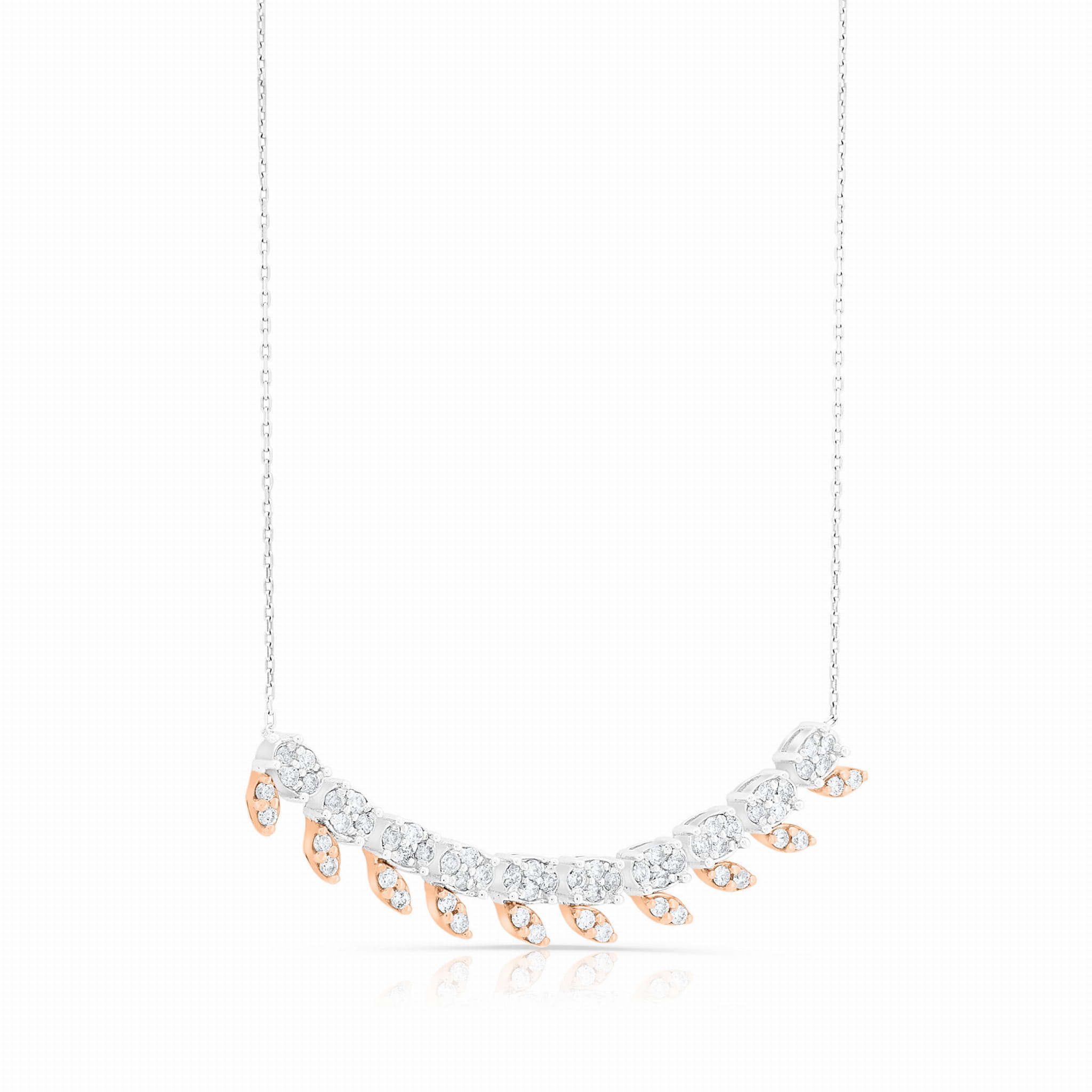 Ten wyjątkowy naszyjnik z diamentami doskonale oddaje piękno natury w świecie biżuterii. Skomponowany z 40 diamentów, ułożonych w białym i różowym złocie, jego kształt przypomina delikatne liście, emanując miłością do otaczającego nas świata.