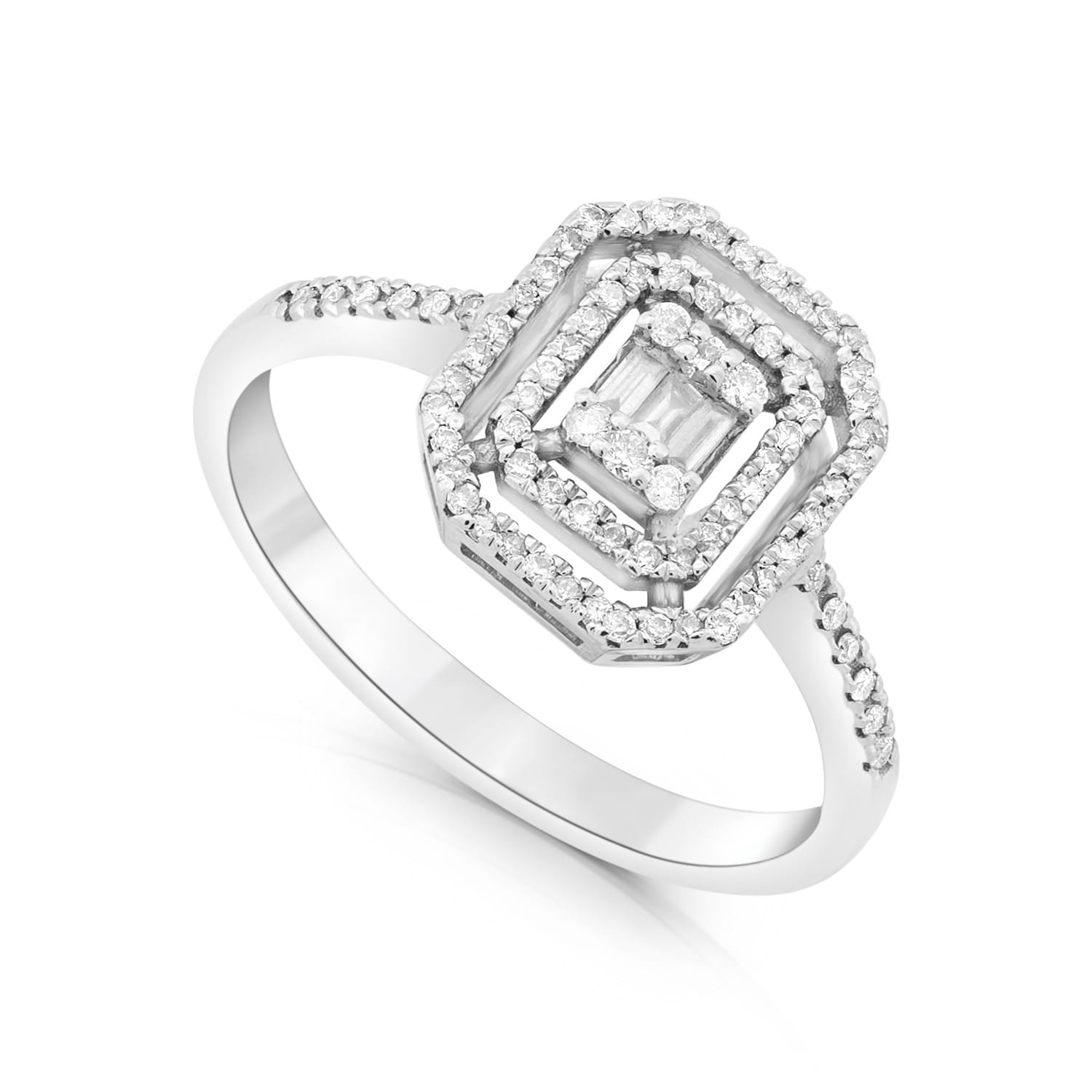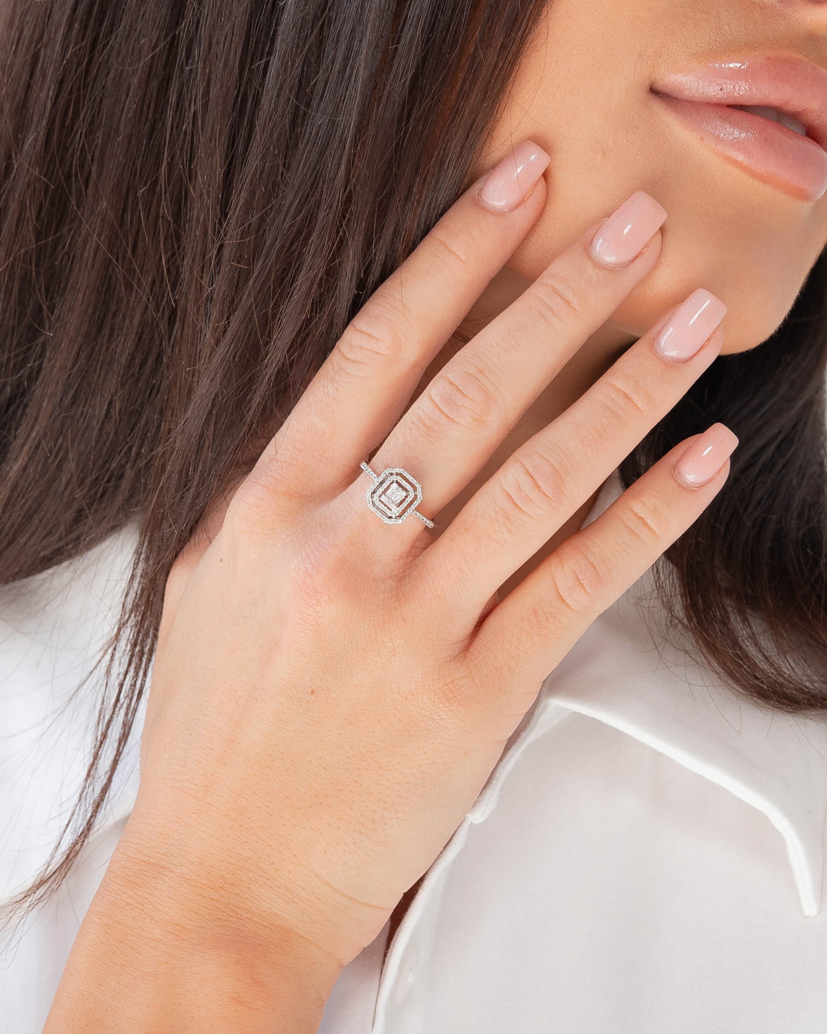 Perfekcyjnie oszlifowane diamenty na kształt brylantu i bagiety, pełne blasku i piękna, tworzą olśniewającą kompozycję na tym wyjątkowym pierścieniu. Nosząc go, będziesz emanować pewnością siebie i wyjątkowym wdziękiem.